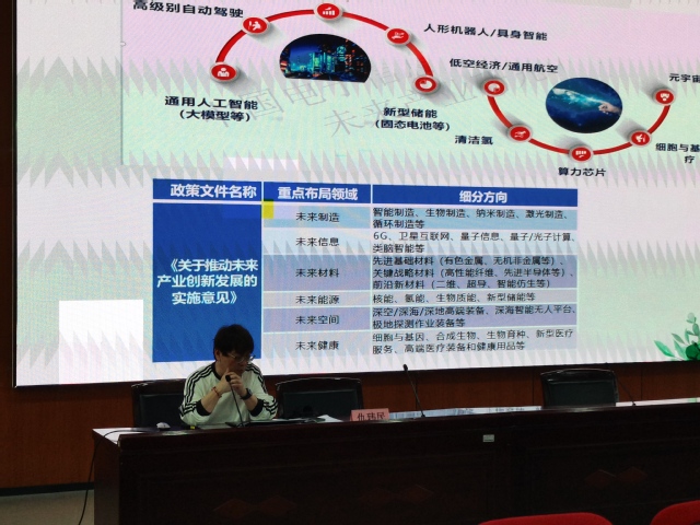 仇玮民首先对《推动未来产业创新发展的实施意见》进行了深入解读,重点分析了未来产业的重点布局领域,包括元宇宙、脑机接口、量子信息等前沿科技方向。仇老师特别结合能机学院的专业特色,介绍了新能源汽车零部件供应商领域的发展潜力,鼓励员工关注行业动态,提前做好职业规划。