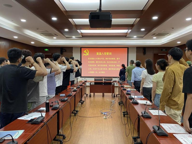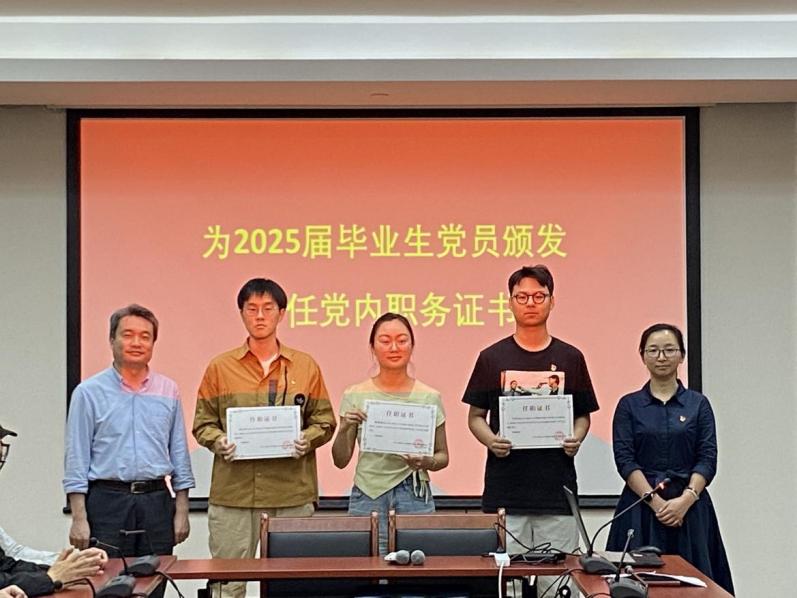 周婷与陈乃超共同为曾经担任过党内职务的毕业生党员代表颁发证书,肯定他们在支部工作中付出的努力与取得的成绩。随后,周婷作为领誓人,带领全体党员同志重温入党誓词。面对鲜红的党旗,党员们高举右拳,铿锵有力的誓言在会场回荡,彰显出党员同志们对党的忠诚与为共产主义事业奋斗终身的决心。
