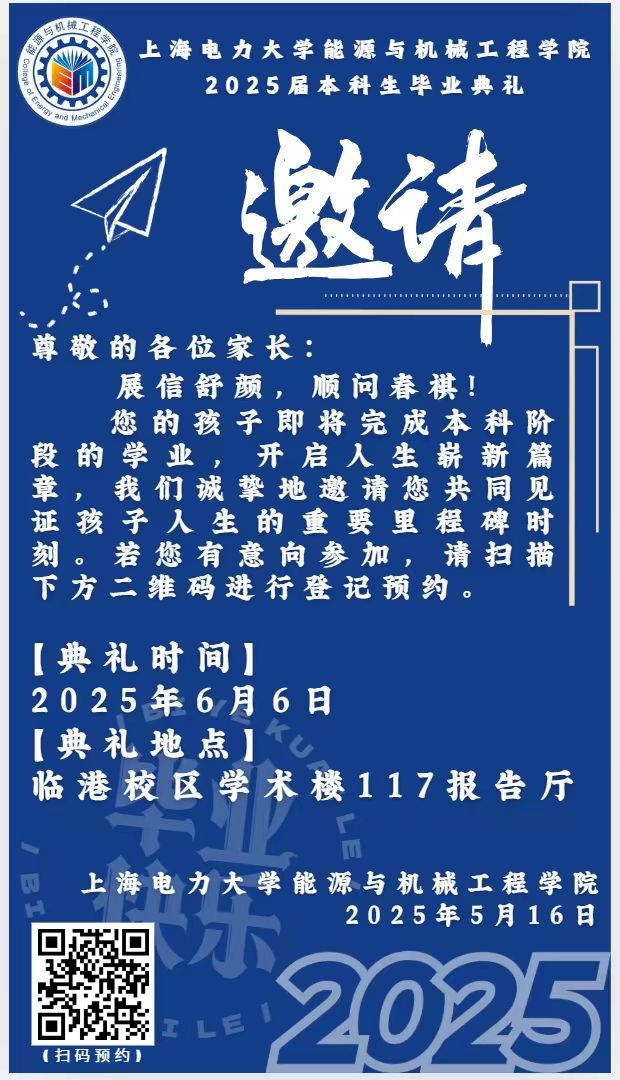 有意向参加毕业典礼的员工家长请于2025年6月3日下午17:00前扫描邀请函中的二维码进行预约登记。(临港校区停车位紧张,有开车进校需求的需提前登记,建议各位家长绿色出行。)