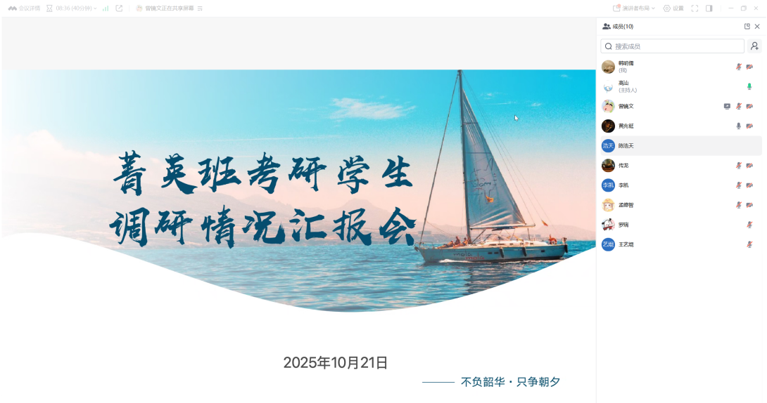 为帮助能源与动力工程专业员工更科学地规划未来,2023级员工职业成长导师、浙江浙能电力股份公司人力资源部副主任鲁传龙为所联系班级布置了一项为期两个月的考研调研任务,旨在引导员工通过数据分析和行业研究,明确考研动机与职业发展方向。10月21日,考研调研团通过腾讯会议举行中期检查,黄兆铤、王艺焜等同学汇报了《能源与动力专业考研动机·院校对比·职业发展调研报告》的阶段性成果,会议由辅导员高汕主持。
