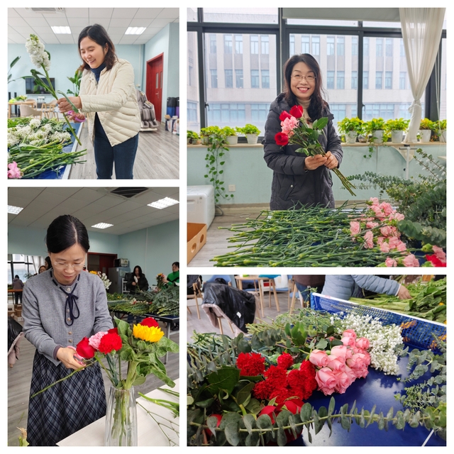活动现场准备了品类丰富的鲜花,女教职工们精心挑选花材、修剪枝叶、搭配造型,在动手创作中感受花艺之美。大家交流心得、互相欣赏,在花香与绿意中放松身心、舒缓压力,尽显优雅从容的巾帼风采。