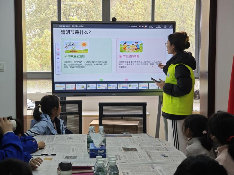 活动伊始,“小汤源”志愿服务队的志愿者们通过生动通俗的科普讲解,为孩子们全方位解读清明的文化内涵与节气特点,揭开其“双重身份”——既是万物复苏、草木萌发的节气信号,也是缅怀先人、寄托哀思、踏青寻春的传统节日。讲解过程中,志愿者们结合屏幕上的春景插画、民俗场景,用趣味问答、案例分享等形式调动孩子们的积极性,孩子们认真聆听、踊跃互动,眼中满是对春日美景与传统民俗的向往之情。