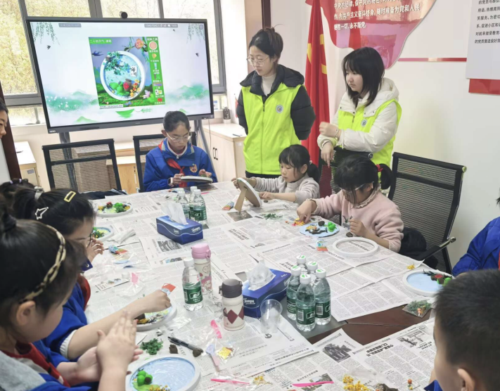 科普结束后,手工创作环节正式拉开帷幕。志愿者们提前准备好圆盘画纸、黏土、彩笔等材料,耐心向孩子们讲解创作技巧。孩子们化身“小小艺术家”,充分发挥想象力与创造力,在画纸上尽情挥洒灵感:用黏土捏出嫩绿的柳枝、娇艳的春花,用彩笔勾勒出清明踏青的温馨场景,将对春天的喜爱、对传统的理解,都凝注在指尖的每一次按压、每一笔描绘中。志愿者们全程俯身陪伴,一对一耐心指导,及时帮助孩子们化解创作难题,鼓励孩子们大胆表达创意,让每一份童真与热爱都能自由绽放。