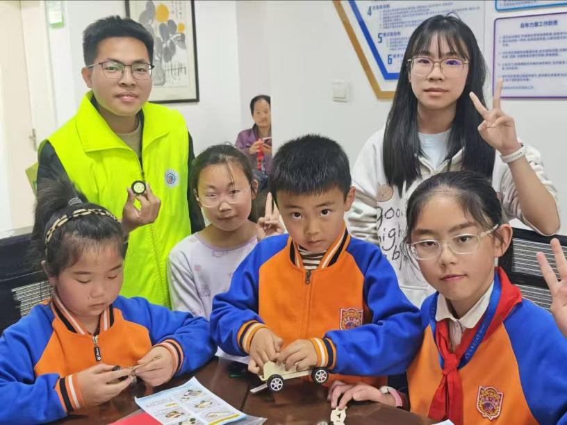 理论科普结束后,趣味手工实践环节,让小朋友们切实感受光能转化的科学原理。志愿者提前备好实验材料,耐心讲解太阳能小车的组装步骤与操作要点。孩子们认真动手、积极思考,在志愿者的协助下完成零件拼装与线路连接,沉浸式体验动手创作的乐趣,