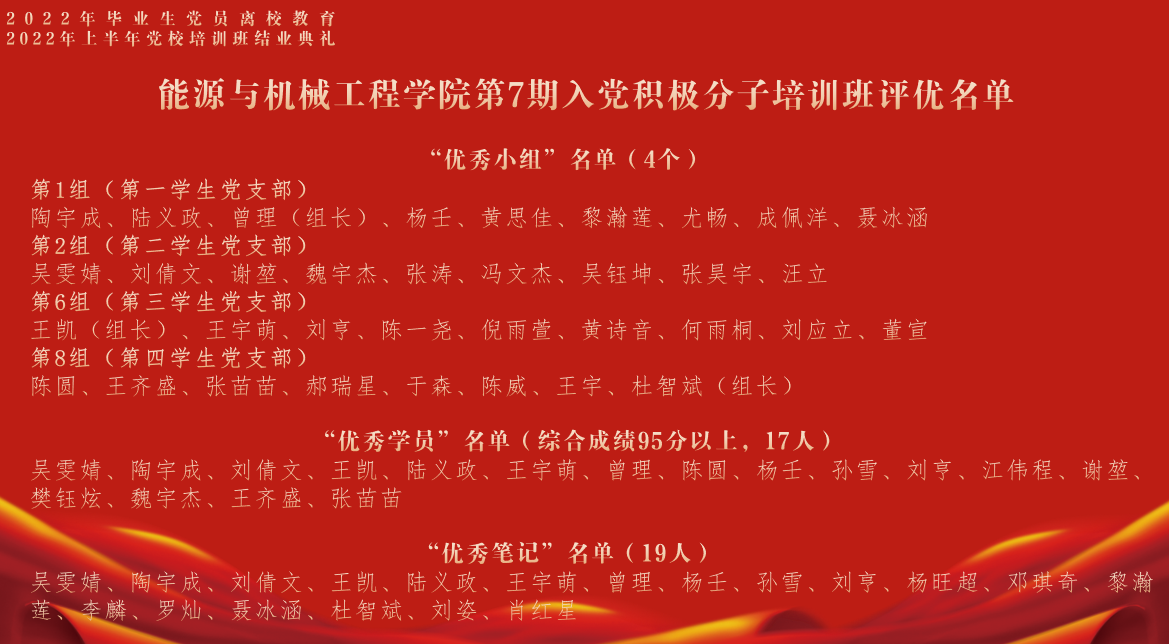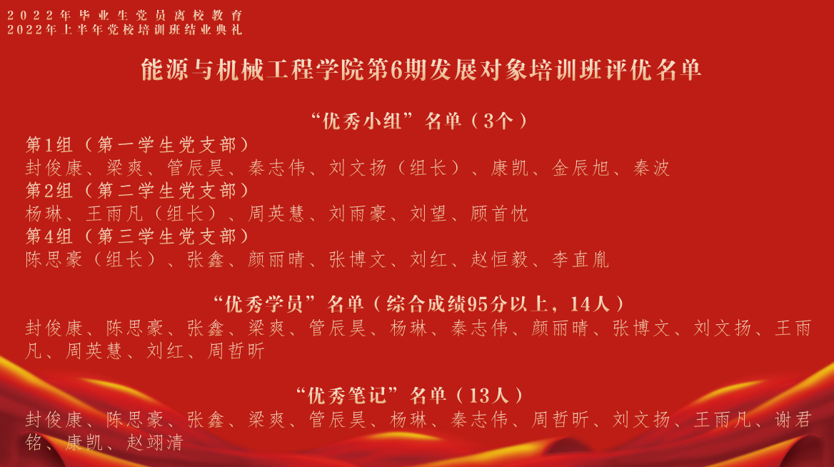 2022年5月21日,能机学院召开了2022届毕业生党员离校教以及2022年上半年党校培训班结业典礼。能机公司党委书记潘卫国、党委副书记周婷、2022届全体毕业生党员及党校培训班学员参加了本次会议。会议由学院专职组织员王喆主持。