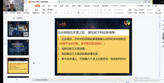 简历不仅是职场人的“身份证”,也是职场人的“说明书”。陈燕首先详细介绍了简历应该包括什么内容,并将简历制作分为三个部分:第一、根据招聘启事,分析HR的“显性需求”和“稳形需求”。第二、用事实匹配HR的“显性需求”和“稳形需求”。第三、针对用人需求,精确制作简历。其次,陈燕就成功的简历必须遵守以下七个原则与同学们进行了分享:其一要采用程序式版面,而非文章式版面;其二要具体的数据做支撑,不要单纯的描述和抒情;其三要针对不同的工作岗位要进行定制化制作;其四要对简历内的信息要进行逻辑分类;其五要用“做了什么”+“做得很好”来描述工作内容;其六语言表达要精练简洁;其七要精益求精,关注细节。