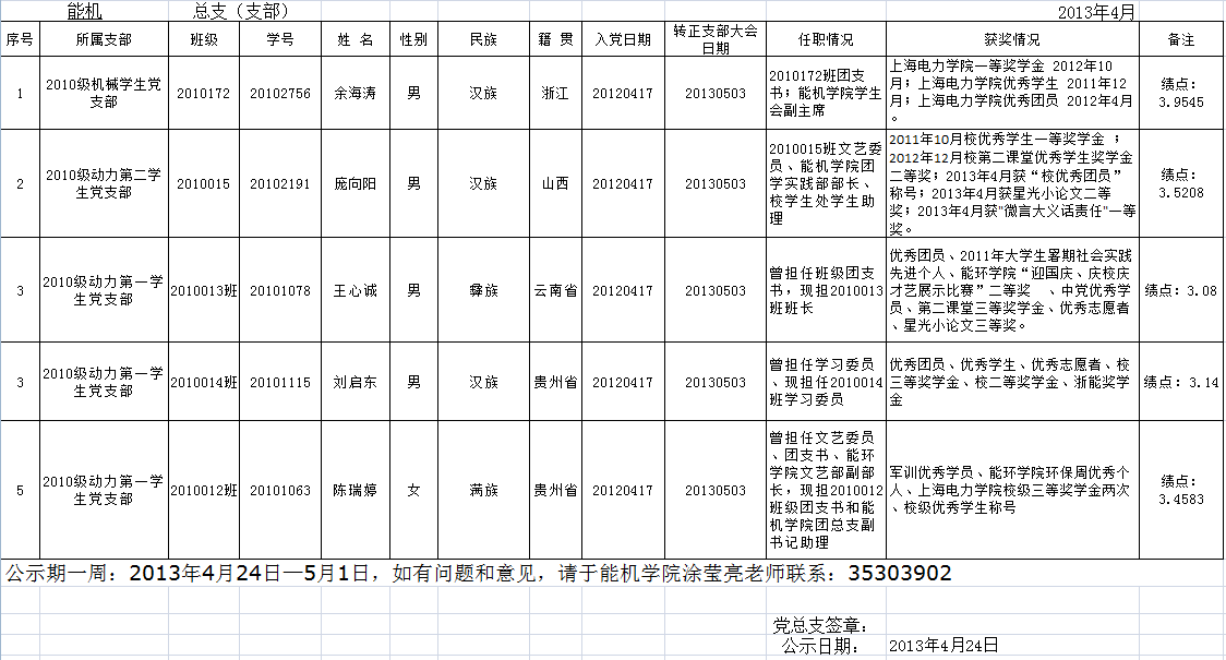 2010级员工党员转正信息公示表(2013.4) 员工党员转正信息公示表