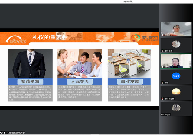 为加强同学们就业技能技巧,提高就业竞争力,为步入职场、步入社会打下良好基础,能机学院于2022年12月5日晚19:00在线上开展了主题为“专家同行 聚力暖冬—雅艺举止、职场芳华”的职场礼仪培训讲座。本次讲座邀请了高级人力资源管理师马群燕作为主讲人,为同学们悉心讲解了礼仪与习惯,气质和仪态,会面与商务,沟通与谈吐。