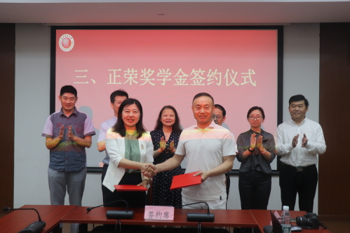 捐赠仪式中,施正荣院士向学校教育发展基金会捐赠一百万元并设立“正荣奖学金”。丛亮与施正荣院士签订协议,张川为施正荣院士颁发捐赠证书,现场领导、老师以及员工共同见证。