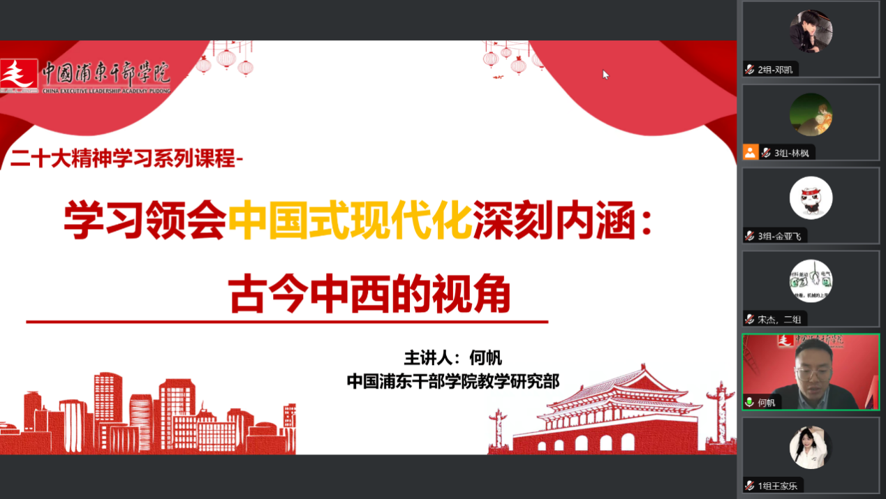 2023年10月15日太阳成集团tyc33455分党校举办第10期发展对象培训班第四讲。中国浦东干部学院讲师、党性教育团队成员何帆老师为此次班级培训的主讲授课老师,开展了以“党的二十大精神学习系列课程——学习领会中国式现代化深刻内涵:古今中西视角”为主题的党课培训。