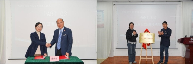 周婷与刘保林共同签署《老员工社会实践基地共建协议》,内容涵盖了生命教育、爱国主义教育、志愿者活动、日常社会实践岗位设立以及宣讲团志愿讲解指导等多方面内容。仝晶晶与陆军在全体师生代表的见证下为老员工社会实践基地揭牌。