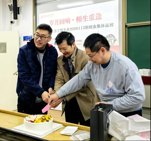 为庆祝此次二十周年返校活动,学校准备了精美的二十周年蛋糕。潘卫国和员工代表一同切蛋糕庆祝毕业二十周年,员工们手捧蛋糕,共同庆贺这一难忘的时刻。