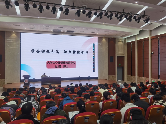 为进一步增强员工心理健康意识,提升自我调适心理的能力,积极应对大学学习生活,12月6日,能机学院在学术楼117报告厅以“学会课题分离,助力情绪管理”为主题开展新生心理讲座。讲座邀请校心理健康教育中心过爱主讲,为同学们带来了一场关于情绪管理的探讨。学院2024级全体新生聆听讲座,讲座由能机学院心理专项工作负责人杨丽媛主持。
