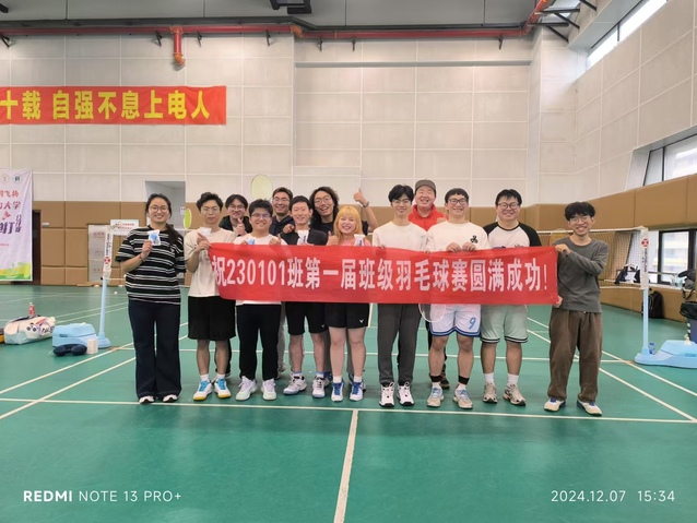 2024年12月7日下午,在积极践行“文明班级”理念的征程中,230101 班成功举办了班级第一届羽毛球比赛,生动展现出强大的班级凝聚力与蓬勃活力,为校园班级文化建设添上了浓墨重彩的一笔。
