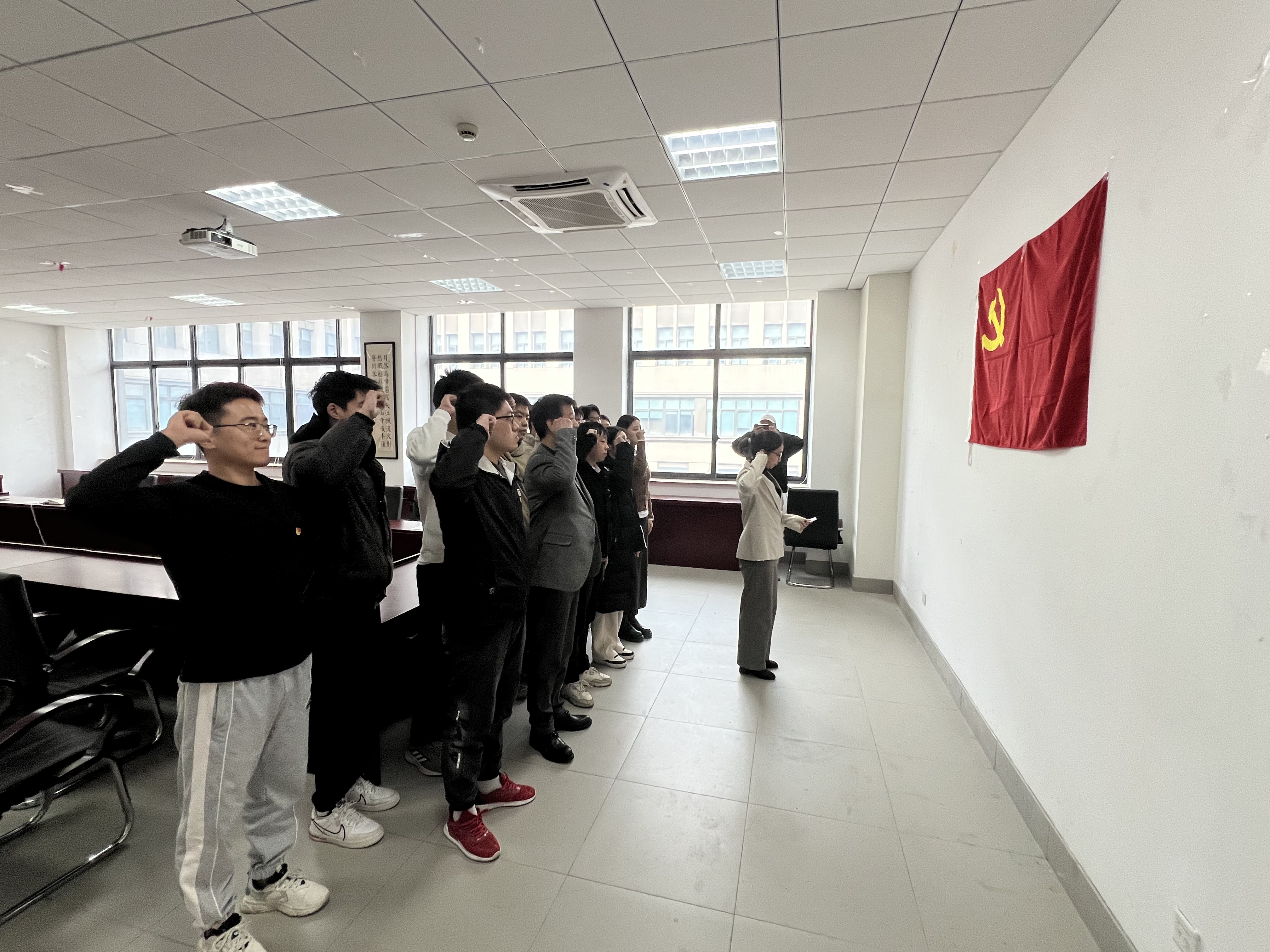 王喆宣读了《中共太阳成集团tyc33455委员会关于批准刘鑫等17位同志为预备党员的备案报告》,周婷作为领誓人带领新吸收的预备党员面向党旗,进行庄严宣誓。